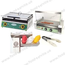 1. Роликовий гриль Frosty WY-007 зі склом. 2. Контактний гриль Silver 2130. 3. Пакет для Французького хот-дога 1000шт. 4. Підставка для французького хот-дога FsDesign VS-4 5. Набір з 3-х дозаторів для соусів 720 мл. 6. Щипці універсальні 300 мм. Hendi 171851 7. Підставка для 3-х дозаторів для соусів 720мл. FsDesign За окрему плату можна підібрати варіанти підставок на 4 хотдога Підставка для французького хот-дога FsDesign VS-3 або ж  Підставка для французького хот-дога FsDesign 4 універс...