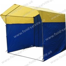 Торговий намет для організації вуличної торгівлі. Стандартне тентове накриття на торговій палатці комбіноване - верх зі світлої тканини (поліестер) щільністю 180 гм.кв. (колір: білий, жовтий) і боки - виконані з тканини тієї ж щільності (синього кольору). Під замовлення можливе виконання наметів в будь-якій кольоровій гамі. Вхідна висота - 1,8 м.