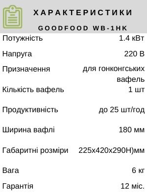 Вафельниці випускаються на китайському виробництві, мають прямокутні форми на 2 вафлі 170х105мм з осередками 4х6 клітин. Корпус вафельниці GoodFood WB1SA виготовлений з нержавіючої сталі.