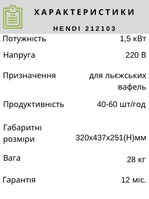Вафельниця HENDI 212103 випускається з 1-єю парою робочих поверхонь, з квадратними коміркамии (4х6) для випічки 2 льежських вафель. Час приготування 2-4 хвилини в залежності від складу тіста.