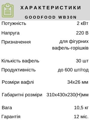 Вафельниці GoodFood WB30N мають прямокутні форми на 30 осередків у вигляді половинок горішків розмірів 34х26мм. Корпус виготовлений з нержавіючої сталі. Робоча поверхня з антипригарним покриттям. Нагрівання здійснюється одночасно зверху і знизу. Терморегулятор 50-300 С, вбудований таймер.