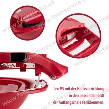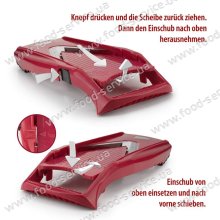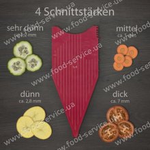 Плоска (безножова) вставка дозволяє нарізати 4 товщини кілець і пластинок. Капуста, помідори, ковбаса, баклажани, лимони, цибулю, гриби - можна відмінно нарізати з регулюванням на 4 товщини (1,2мм; 2,8мм; 5мм; 7мм). Крім того, її ж можна поставити в положення "блок" і закрити цією вставкою наглухо леза на основній рамі під час її зберігання. Зміна товщини нарізки на вставці відбувається шляхом легкого натискання зі зміщенням, а назад - натисканням на бічну кнопку на корпусі.