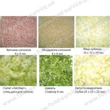 2. Велика розмаїтість форм нарізки (35 дисків, що дозволяють виробляти всі види нарізки: стружку, хвилясту нарізку, соломку, жюльєн, брусочки і кубики (від 5х5х5 мм до 25х25х25 мм) з точністю і високою якістю).