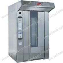 Ротаційні печі є серцем середніх і малих підприємств хлібопекарської та кондитерської галузі. Ці печі дозволяють випікати широкий асортимент хлібобулочних та кондитерських виробів.   Процес випічки виробів здійснюється на деках встановлених в візках. Візки встановлюються в камеру печі і приводиться в обертання навколо своєї осі. Ротаційні печі оснащені циркуляційним вентилятором у верхній частині, який забезпечує примусову конвекцію в камері.   Ротаційні печі серії Roto Real фірми Real Forni мають сучасну міцну конструкцію з нержавіючої сталі. Як джерело тепла застосований теплообмінник з новою системою циркуляції повітря, що забезпечує оптимальний процес випічки і економію енергоспоживання.   Опис Камера згоряння: виготовлена з спеціальної високоміцної термічної нержавіючої сталі; у верхній частині печі знаходиться вентилятор для оптимального обдування і більш ефективного теплообміну, що зменшує витрату палива. Камера випічки: виготовлена з нержавіючої сталі AISI 304; привід обертання візка розташований у верхній частині печі (кріплення візка - га...
