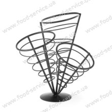 Чорна проволочна підставка для картоплі-фрі. Для трьох пакетів. Складається з трьох конусів різної довжини на єдиному підставі. Довжина конусів: 17, 20, 27 см. Діаметр конусів 13 см.