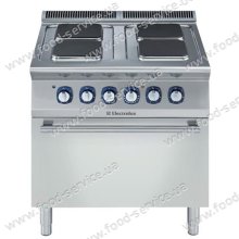 Плита електрична 4-х конфорочна ELECTROLUX E7ECEH4QE0 має 4 квадратні чавунні конфорки 2,6 кВт герметично впаяні в штамповану верхню панель. В нижній частині конструкції розташована духовка з дверцятами збільшеної товщини для поліпшення теплоізоляції. Електрична духовка оснащена незалежними термостатами для верхнього і нижнього нагрівальних елементів. Духовку з внутрішніми поверхнями з нержавіючої сталі і 3 рівнями направляючих для гастроємностей GN 2/1 або 2 перфорованих контейнерів. У підставі духовки - сталева емальована рифлена пластина. Термостатичне регулювання температури від 140°С до 300°С. Герметична система рукояток для регулювання температури.