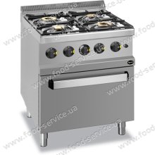 Газова плита з газовою жарочною шафою Apach APRG-77FG 700-ї серії з 4 знімними газовими пальниками, два з яких мають потужність 3,5 кВт, а дві інші - 6 кВт. Пальники, виготовлені з глазурованого чавуну, оснащені стабілізатором полум'я. Розташування пальників дозволяє використовувати посуд діаметром до 38 см. Газова духовка із закругленими краями на 3 рівня завантаження підходить для роботи з гастроємностями GN 2/1. Газовий духовка оснащена пальником потужністю 6 кВт зі стабілізатором полум'я і п'єзоелектричним підпалом. Корпус обладнання виконаний з нержавіючої сталі AISI 304 товщиною 1 мм.