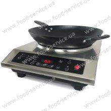 Плита індукційна 1-конфорочна WOK. Призначена для сковорідок WOK. Скло WOK розміром d280х42h мм. У комплекті сковорода WOK d380х95h мм. Корпус з нержавіючої сталі AISI 304. Поверхня з високоякісного жаростійкого скла чорного кольору. Цифровий дисплей. Електромеханічна панель управління. Електронний захист від перегріву. Багаторівневе регулювання температури 60-240С. 8 рівнів потужності 400-3500Вт. Електронний таймер 180 хвилин. Тип установки: установка на столі. Елегантні металопластикові ніжки. Примусове охолодження.
