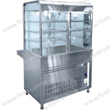 Зверху над стільницею прилавка розташована охолоджуюча вітрина з трьома рядами скляних полиць або решіток, для роздачі їжі.