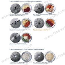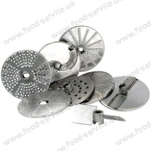 диск шинковочний МПР-350М.13.00.00 (нарізка соломкою 4х3 мм), диск тонкого подрібнення МПР-350М.12.00.00 (для дерунів), диск терочний МПР-350М.11.00.00 (нарізка розміром 1,3х3,5 мм), ніж дисковий МПР-350М.10.00.00 (нарізка скибочками завтовшки 2 мм), диск протиральний МПР-350М.00.00.05 з отворами діаметром 1 , 5 мм