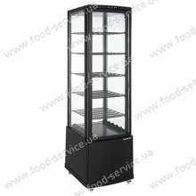 Шафа холодильна Frosty RT280C-3 black вигнутими дверима.   Об'єм 280л. Скло з чотирьох сторін. Подвійні склопакети. 5 хромованих полиць-решіток 430х385мм. Можна змінювати висоту полиць. Бокова LED підсвітка з 2-х сторін. Цифровий регулятор температури та дисплей. Температура 0...+12°C. Вентильована система охолодження. Зовнішня обдувка скла з чотирьох сторін. Авторозморожування. 4 поворотні колеса (2 них з гальмами).   Корпус виконаний з чорного/білого пластику. ...