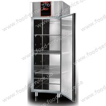 Шафа на колесах об'ємом 454л, має одні глухі дверцята з петлями праворуч, чотири решітчасті полиці з пластиковим покриттям GN2/1 та чотири комплекти гаків. Зовнішнє та внутрішнє оздоблення виготовлене з нержавіючої сталі AISI304. Електронна панель управління. Динамічне охолодження. Температура від -18 до -22˚С. Авторозморозка.   Напруга 220В. Потужність 0.28кВт. Габарити нетто ДхШхВ 710х809х2027мм. Вага нетто 115кг. Габарити ШхГхВ 760х840х2090мм. Вага 125кг. Країна: Італія. ...