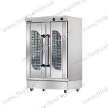 Розстроєчна шафа призначена для кінцевого вистоювання тістових заготовок перед випічкою. У Розстоєчні шафі підтримується мікроклімат з температурою +20...+60°С і відносною вологістю. Підвищена температура необхідна для прискорення бродіння тесту, а підвищена вологість для запобігання утворення на поверхні тесту висохлої плівки-скоринки, яка при випічці призводить до розривів на поверхні хлібо-булочних виробів. Расстоечний шафа оснащений пультом управління з регулюванням температури. При використанні розстоїчної шафи тестові заготовки отримують оптимальні умови для дозрівання тесту. За рахунок цього випічка виходить смачною, має привабливий зовнішній вигляд і набуває пористу структуру м'якушки. Ручне керування. Зволоження. Напрямні - металеві трубки. Регулювання вологості. Без підключення до водопроводу. Вентилятор на задній стінці. Механічний датчик рівня води. Загальна камера. Подвійні двері зі склом. Корпус - нержавіюча сталь. ...
