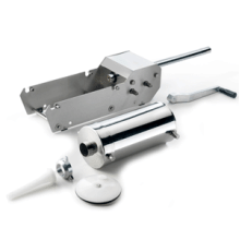 Завдяки ручному режиму роботи ви зможете з точністю до міліметра розрахувати наповнення оболонки м'ясним фаршем та готувати відповідно до власних побажань. Корпус та циліндр шприца виконаний із харчової нержавіючої сталі AISI 304. Поршень із харчового нейлону з вантузом для випуску повітря. Коробка передач із оцинкованої сталі. Зубчаста передача із шліфованої та загартованої сталі. Проходження передачі по 4 герметичних підшипниках. Редукторна система із подвійною швидкістю. Насадки із білого харчового нейлону. Фіксуючий затискач. Опції: -Зубчаста рейка із нержавіючої сталі.