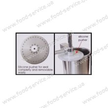 Шприц ковбасний Airhot SV-3 механічний зі зворотним повітряним клапаном використовується для приготування купатів, ковбас та інших м'ясних виробів в м'ясних та ковбасних цехах та закладах громадського харчування. Корпус виготовлений з нержавіючої сталі.   Об'єм 3 л. Циліндр 1..