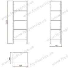 Стелаж з 5-ма неперфорованими полицями, які можна регулювати по висоті, розміром 700х550мм, виготовнений з нержавіючої сталі.