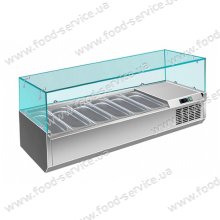 Вітрина холодильна Berg G-VRX 1500/380 (пряме скло) під 5хGN1/3 + 1хGN1/2 (в комплект не входять) є практично ідеальним варіантом для піцерій і призначені для короткочасного зберігання і демонстрації, попередньо охолоджених продуктів (салатів, закусок, гарнірів) в магазинах, кафе, барах, ресторанах, суші-барах. Найбільш широко застосовуються в піцеріях для зберігання начинки (начинки для піци). Вітрину можна використовувати в якості надбудови на холодильному столі для короткочасного зберігання начинок.     З тильного боку повинна бути легкодоступною виставляються страв для обслуговуючого персоналу. • виконані з нержавіючої сталі; • статичне охолодження; • гастроемкости нахилені до відкритої стінці для зручності роботи з вітриною (в комплект не входять); • гастроемкости в комплект не входять; • холодоагент R134A; • максимальна глибина GN 150 мм. ...