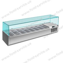 Вітрина холодильна Berg G-VRX 1800/380 (пряме скло) під 8хGN1/3 (в комплект не входять) є практично ідеальним варіантом для піцерій і призначені для короткочасного зберігання і демонстрації, попередньо охолоджених продуктів (салатів, закусок, гарнірів) в магазинах, кафе, барах, ресторанах, суші-барах. Найбільш широко застосовуються в піцеріях для зберігання начинки (начинки для піци). Вітрину можна використовувати в якості надбудови на холодильному столі для короткочасного зберігання начинок.     З тильного боку повинна бути легкодоступною виставляються страв для обслуговуючого персоналу. • виконані з нержавіючої сталі; • статичне охолодження; • гастроемкости нахилені до відкритої стінці для зручності роботи з вітриною (в комплект не входять); • гастроемкости в комплект не входять; • холодоагент R134A; • максимальна глибина GN 150 мм. ...