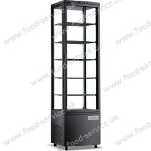 Вітрина холодильна GoodFood RT118L чорна використовується для демонстрації прохолодних напоїв чи кондитерських виробів. Корпус виготовлений з пластику.   Подвійний склопакет із 4-х сторін.  Двостороннє бокове світлодіодне (LED) підсвічування. Хромовані полиці. Ди..