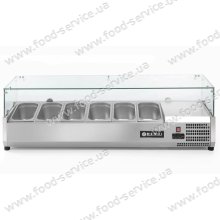 Вітрина для топпінгу Hendi 232972 (пряме скло) на 6xGN 1/3 глибиною до 150мм є практично ідеальним варіантом для піцерій і призначені для короткочасного зберігання і демонстрації, попередньо охолоджених продуктів (салатів, закусок, гарнірів) в магазинах, кафе, барах, ресторанах, суші-барах. Найбільш широко застосовуються в піцеріях для зберігання топпінгу (начинки для піци). Вітрину можна використовувати в якості надбудови на холодильному столі для короткочасного зберігання начинок.