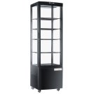 Корпус - чорний, білий пластик.   Температура 0...+12°C. Цифровий термостат. Бокове LED підсвічування з двох сторін. Скло з 4-х сторін. Двері вигнуті. 4 регульованих хромованих полиць. Вентильоване охолодження. Автовідтаювання. ..