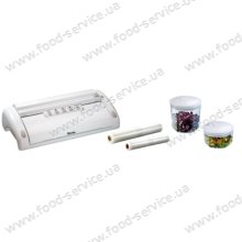 2 емкости для вакуумной упаковки (0,7 л, 1,4 л), 1 вакуумный шланг, 2 вакуумных ролика фольги (22 см, 28 см)