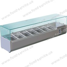 Витрина для топпинга Frosty VRX 1600/330 (прямое стекло) под 7хGN1/4 является практически идеальным вариантом для пиццерий и предназначены для кратковременного хранения и демонстрации, предварительно охлажденных продуктов (салатов, закусок, гарниров) в магазинах, кафе, барах, ресторанах, суши-барах. Наиболее широко применяются в пиццериях для хранения топпинга (начинки для пиццы). Витрину можно использовать в качестве надстройки на холодильном столе для кратковременного хранения начинок.  В зависимости от длины витрины могут быть предусмотрены под разное количество 1/4 GN. С тыльной стороны обеспечен удобный доступ к выставляемым блюдам для обслуживающего персонала. • выполнены из нержавеющей стали с алюминиевым анодированным профилем. • статическое охлаждение; • без раздвижной стеклянной дверки; • гастроемкости наклонены к открытой стенке для удобства работы с витриной (в комплект не входят);. • дополнительно могут комплектоваться гастроемкостями GN 1/4....